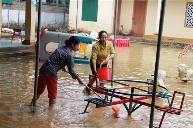 Dọn vệ sinh trường lớp đón học sinh trở lại trường tại Thanh Chương, Nghệ An. (Ảnh: Bích Huệ/TTXVN)