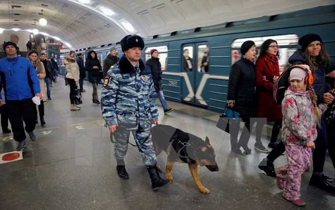 Cảnh sát Nga thắt chặt an ninh tại nhà ga tàu điện ngầm ở thủ đô Moskva. (Nguồn: EPA/TTXVN)