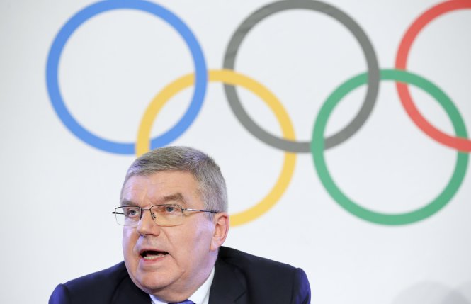Chủ tịch IOC Thomas Bach công bố quyết định cấm Nga tham dự Olympic mùa đông 2018 tại Lausanne (Thụy Sĩ). Ảnh: Reuters