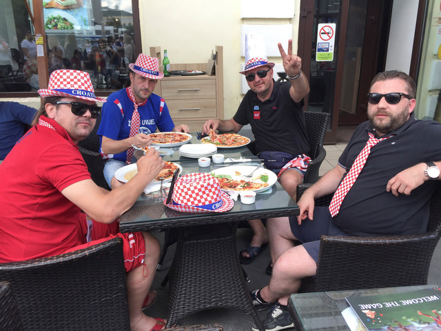 Người hâm mộ của tuyền Croatia ăn uống trên phố Nikolskaya ở thủ đô Matxcơva trong khi chờ trận chung kết ngày 15-7 - Ảnh: REUTERS
