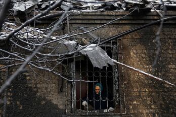 Tòa chung cư bị phá hủy ở Koshytsa, ngoại ô thủ đô Kiev, trong chiến dịch quân sự của Nga tại Ukraine, ngày 25/2/2022. (Ảnh: AFP/TTXVN)