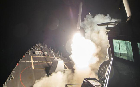 Tàu chiến Mỹ ở Địa Trung Hải bất ngờ nã 59 tên lửa hành trình vào căn cứ không quân Syria rạng sáng 6/4. Ảnh: Reuters