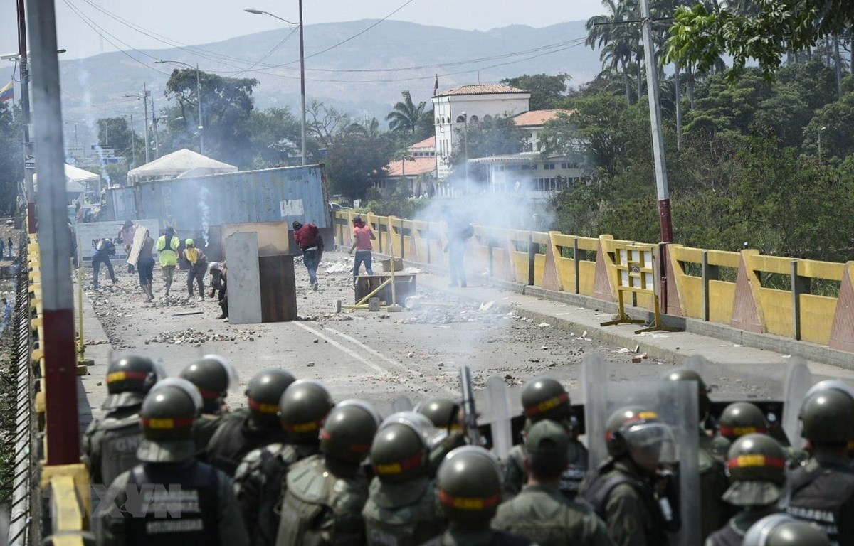 Người biểu tình ủng hộ phe đối lập xung đột với Lực lượng biên phòng Venezuela tại cây cầu quốc tế ở thành phố San Antonio del Tachira, giáp giới Colombia ngày 24/2/2019. (Ảnh: AFP/TTXVN)