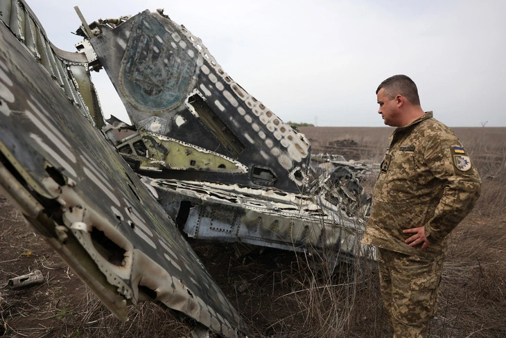 Trung tá Serhiy Verbytsky của Ukraine bên cạnh phần còn lại của chiếc máy bay SU-24M do ông cầm lái ở vùng Kharkov, Ukraine, ngày 17/4. (Ảnh: AFP)