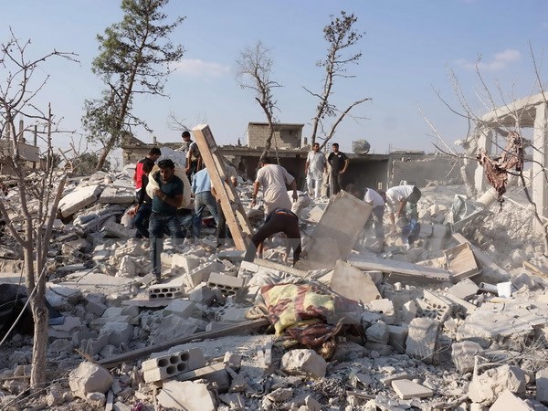 Tìm kiếm các nạn nhân dưói những đống đổ nát sau vụ không kích tại tỉnh Idlib ngày 20/9. (Nguồn: AFP/TTXVN)