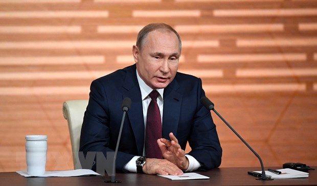 Tổng thống Vladimir Putin trong buổi họp báo cuối năm. (Ảnh: AFP/TTXVN)