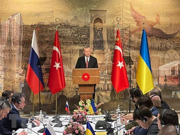 Tổng thống Thổ Nhĩ Kỳ Recep Tayyip Erdogan (giữa) trong cuộc gặp phái đoàn Nga (trái) và Ukraine (phải) tại thành phố Istanbul, ngày 29/3/2022. (Ảnh: AFP/TTXVN)