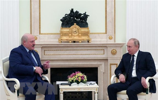 Tổng thống Belarus Alexander Lukashenko (trái) và Tổng thống Nga Vladimir Putin (phải) tại cuộc hội đàm ở Moskva, Nga, ngày 11/3/2022. (Ảnh: AFP/TTXVN)