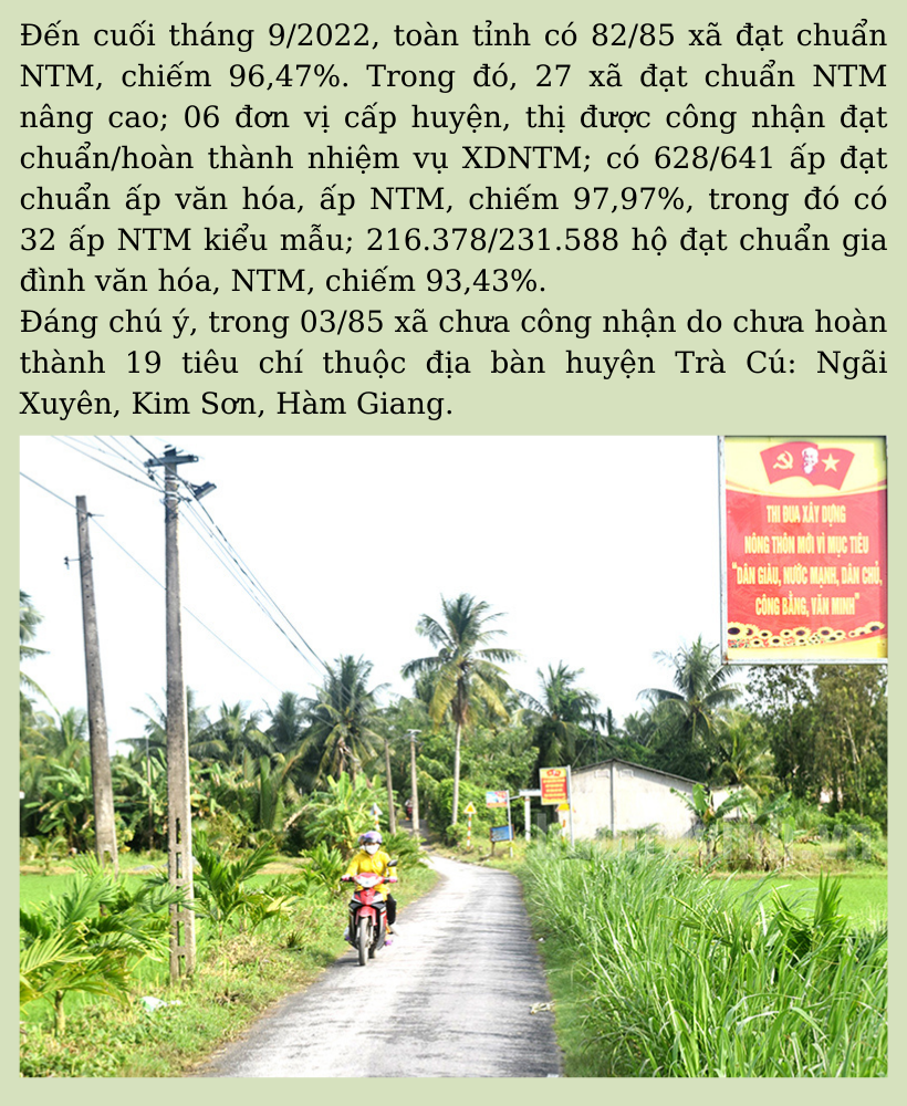 Ngày 05/10, Ban Thường vụ Huyện ủy Trà Cú tổ chức hội nghị sơ kết tình hình thực hiện nghị quyết 09 tháng, triển khai nhiệm vụ công tác 03 tháng cuối năm 2022. Kết luận hội nghị, ông Dương Văn Triệu, Tỉnh ủy viên, Bí thư Huyện ủy nhấn mạnh: từ nay đến cuối năm 2022, cả hệ thống chính trị tập trung, dồn sức thực hiện thắng lợi các mục tiêu, chỉ tiêu Nghị quyết năm 2022 đã đề ra. Trong đó, chỉ đạo thực hiện nhiệm vụ XDNTM, đảm bảo đạt chỉ tiêu nghị quyết năm 2022 đã đề ra; hỗ trợ Ngãi Xuyên đạt chuẩn NTM vào cuối năm 2022.