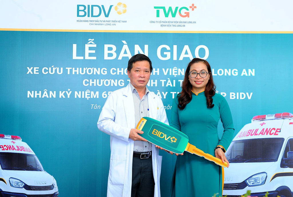 Nhân dịp 65 năm thành lập BIDV, Ngân hàng trao tặng 65 xe cứu thương cho các cơ sở y tế thuộc các tỉnh, thành phố trên toàn quốc. Trong đó, tại địa bàn Long An, BIDV tài trợ 1 xe cứu thương tiêu chuẩn mang nhãn hiệu IVECO có giá trị 1,2 tỉ đồng cho Bệnh viện TWG Long An.