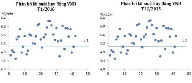 Sang nửa đầu tháng 1/2016, có 3 ngân hàng điều chỉnh tăng lãi suất khoảng 0,1-0,3%/năm ở các kỳ hạn trên 6 tháng. Đây là các ngân hàng thương mại cổ phần nhỏ và mức điều chỉnh thấp nên lãi suất huy động bình quân gia quyền toàn hệ thống vẫn tiếp tục ổn định so với tháng 12/2015.