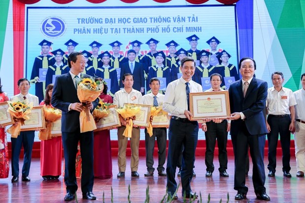 Phó giáo sư Nguyễn Thanh Chương, Phó Hiệu trưởng Đại học Giao thông Vận tải đại diện trường nhận bằng khen tập thể tiêu biểu xuất sắc. (Ảnh: PV/Vietnam+).