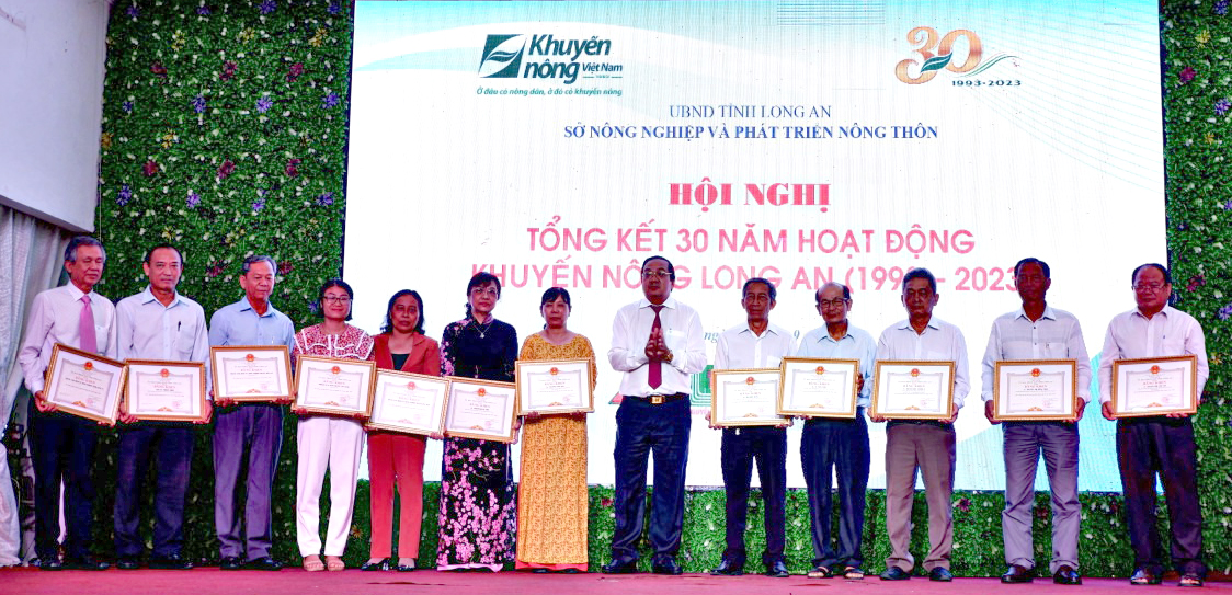 Phó Chủ tịch UBND tỉnh - Nguyễn Minh Lâm tặng bằng khen của UBND tỉnh cho các cá nhân, tập thể có thành tích xuất sắc trong 30 năm hoạt động khuyến nông