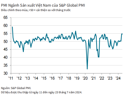 Báo cáo của S&P Global, tháng 7-2024, Chỉ số Nhà quản trị mua hàng (PMI) của ngành sản xuất Việt Nam đạt 54,7 điểm, cho thấy các điều kiện kinh doanh của ngành sản xuất tiếp tục cải thiện. Sự cải thiện đáng kể được ghi nhận ở tất cả các lĩnh vực hàng hóa tiêu dùng tiêu dùng, hàng hóa trung gian và hàng hóa đầu tư cơ bản. Đây cũng là tháng thứ 4 liên tiếp, chỉ số PMI vượt ngưỡng 50 điểm.