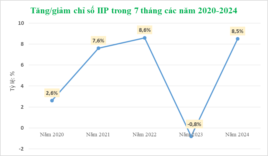 Còn theo Tổng cục Thống kê, trong 7 tháng năm 2024, chỉ số sản xuất công nghiệp (IIP) ước tính tăng 8,5% so với cùng kỳ năm trước (cùng kỳ năm 2023 giảm 0,8%) và là mức tăng cao thứ 2 của 7 tháng trong 5 năm qua. Cụ thể, tốc độ tăng/giảm chỉ số sản xuất công nghiệp 7 tháng các năm 2020-2024 lần lượt là: 2,6%; 7,6%; 8,6%; -0,8% và 8,5%.