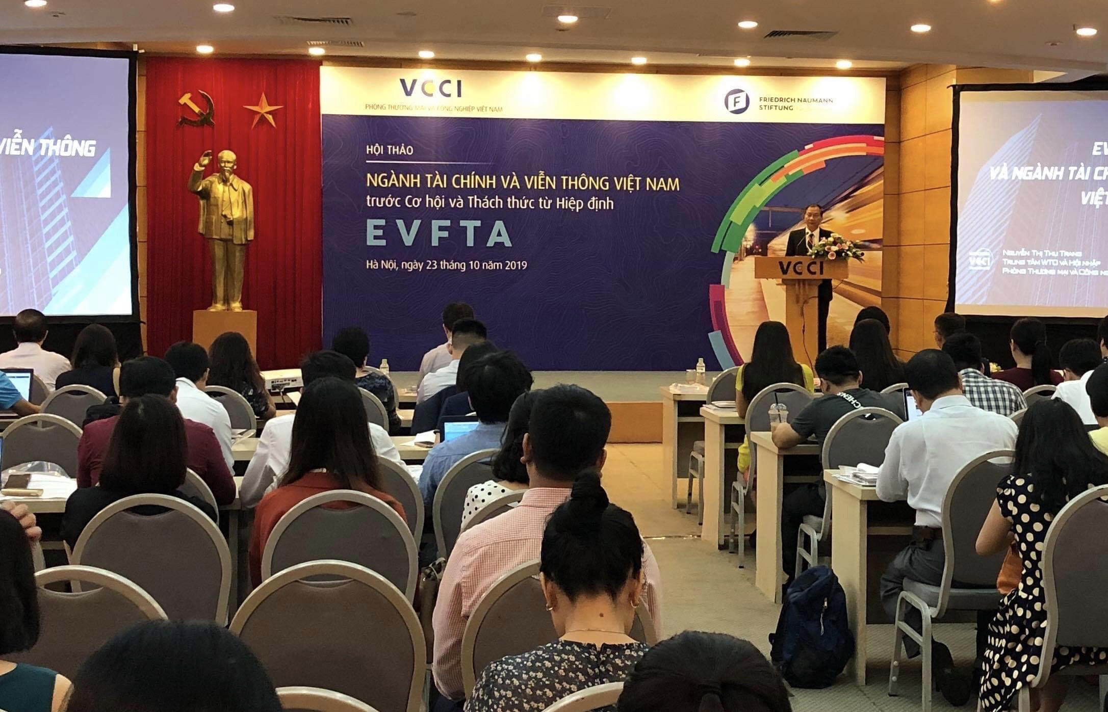 Tại hội thảo, các đại biểu được nghe giới thiệu về các cam kết EVFTA tác động tới ngành tài chính, các cam kết liên quan tới các lĩnh vực bảo hiểm, ngân hàng, chứng khoán; các tác động trực tiếp/gián tiếp từ EVFTA tới thị trường và các doanh nghiệp dịch vụ tài chính Việt Nam. Các cam kết EVFTA liên quan tới ngành ngành viễn thông cũng như tác động gián tiếp và trực tiếp tới thị trường này với các doanh nghiệp. Theo đó sẽ những thách thức về áp lực cạnh tranh từ các nhà cung cấp dịch vụ nước ngoài trong bối cảnh hội nhập FTA cùng với đó là yêu cầu của khách hàng với các dịch vụ này sẽ ngày càng cao, ứng dụng công nghệ thông tin và thách thức trong bảo mật thông tin, bảo đảm an toàn giao dịch…