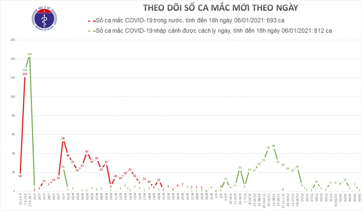 Tính đến 18h ngày 06/01: Việt Nam có tổng cộng 693 ca mắc COVID-19 do lây nhiễm trong nước, trong đó số lượng ca mắc mới tính từ ngày 25/7 đến nay: 553 ca.
