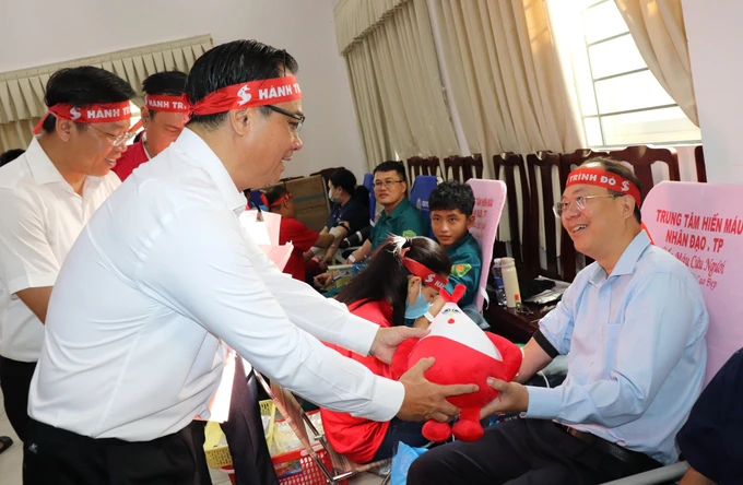 | Phó Chủ tịch Trung ương Hội Chữ thập đỏ Việt Nam Vũ Thanh Lưu tặng hoa và quà cảm ơn Phó Bí thư Thường trực Thành ủy TP Hồ Chí Minh Nguyễn Hồ Hải đã tham gia hiến máu tình nguyện (Ảnh: Thái Phương) |