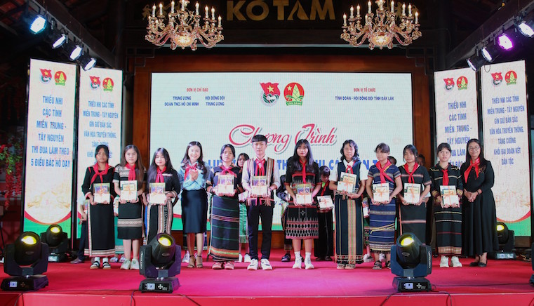| Bí thư Trung ương Đoàn, Chủ tịch Hội đồng Đội Trung ương Nguyễn Phạm Duy Trang và Trưởng Ban Dân vận Tỉnh ủy, Chủ tịch Ủy ban Mặt trận Tổ quốc Việt Nam tỉnh Đắk Lắk H’Kim Hoa Byă (ngoài cùng bên phải) trao học bổng cho thiếu nhi các dân tộc tiêu biểu |