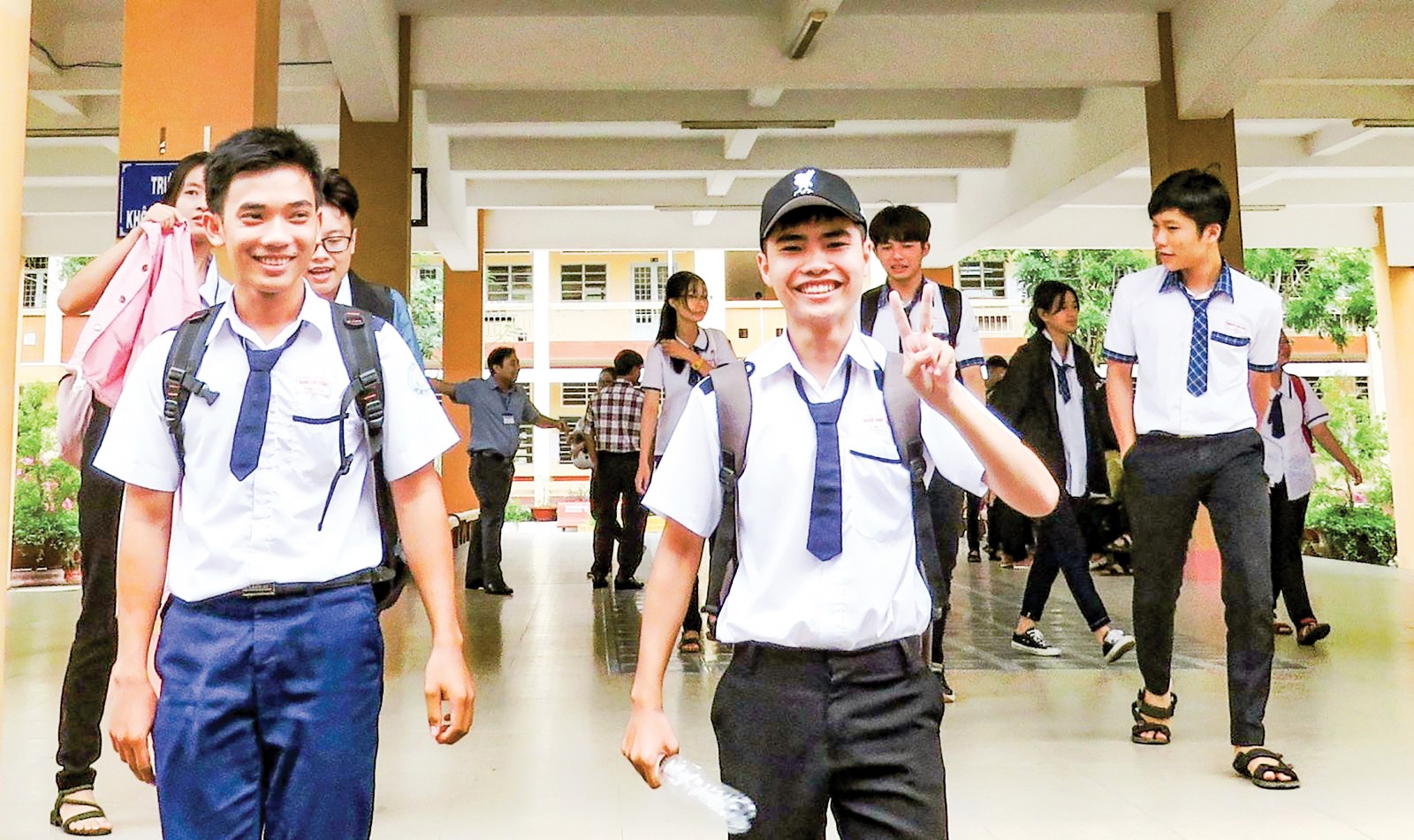 Thí sinh hớn hở ra về sau giờ thi bài thi tổ hợp Khoa học tự nhiên, tại điểm thi Trường THPT Thới Long, quận Ô Môn. Ảnh: B.NG