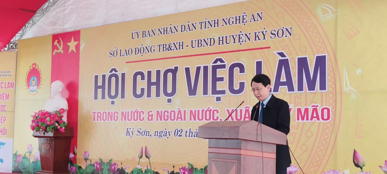 | Đ/c Vi Ngọc Quỳnh - Phó Giám đốc Sở LĐ-TB và XH Nghệ An phát biểu khai mạc tại Hội chợ việc làm Xuân Quý Mão 2023, huyện Kỳ Sơn. |