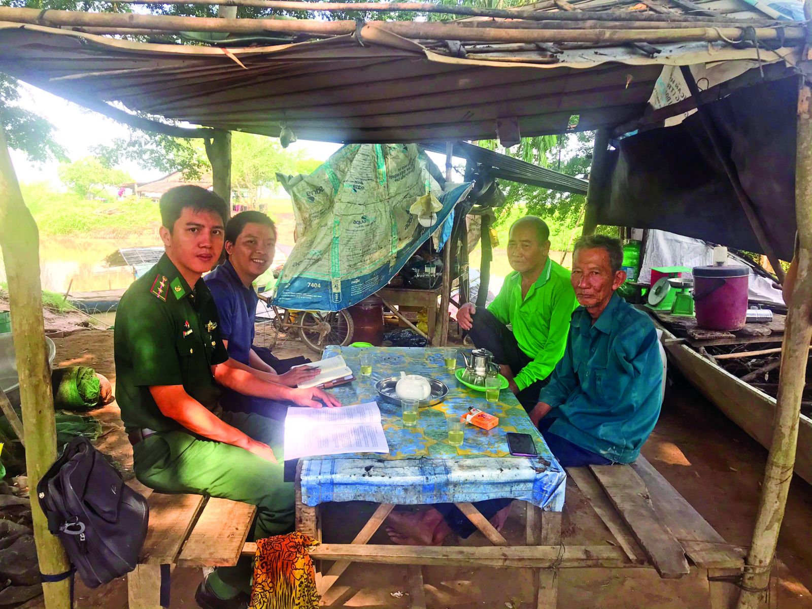 Nghề báo đi nhiều, gặp gỡ nhiều hoàn cảnh khác nhau giúp bản thân thêm trân trọng cuộc sống (Trong ảnh: Phóng viên Thanh Mỹ, Báo Long An, (trong cùng bên trái) trong một lần tác nghiệp tại xã biên giới Hưng Hà, huyện Tân Hưng)