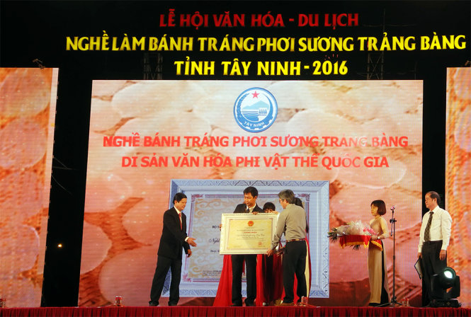 Đại diện Bộ VHTT&DL đã trao chứng nhận bằng di sản văn hóa phi vật thể cho nghề làm bánh tráng phơi sương Trảng Bàng, tỉnh Tây Ninh.