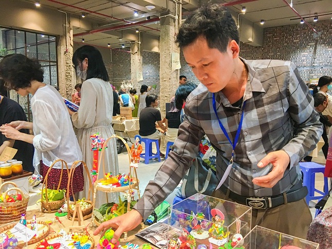 | Nghệ nhân Đặng Văn Hậu tham gia Hội chợ quảng bá sản phẩm thủ công tại Hà Nội. (Ảnh: NM) |