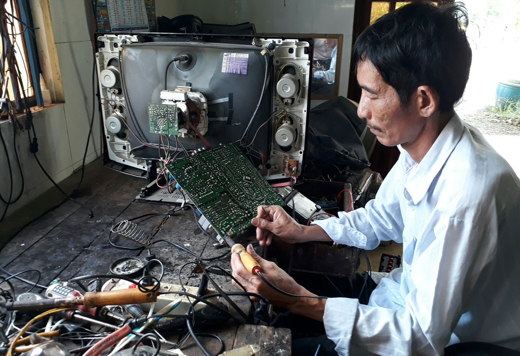 Anh Trần Văn Thuần đang sửa chữa các thiết bị điện tử