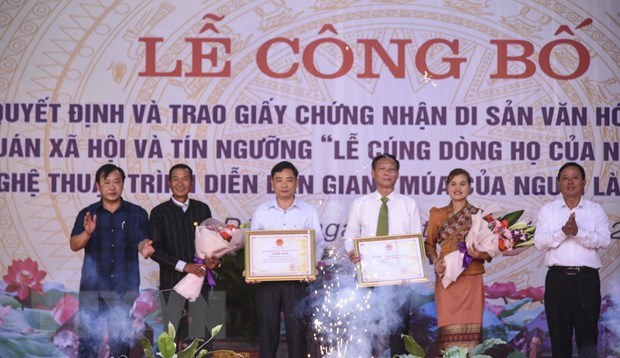 Trao Chứng nhận Di sản Văn hóa Phi vật thể Quốc gia Nghệ thuật trình diễn dân gian 'Múa của người Lào' tỉnh Điện Biên cho lãnh đạo các địa phương và các chủ thể. (Ảnh: Xuân Tư/TTXVN)