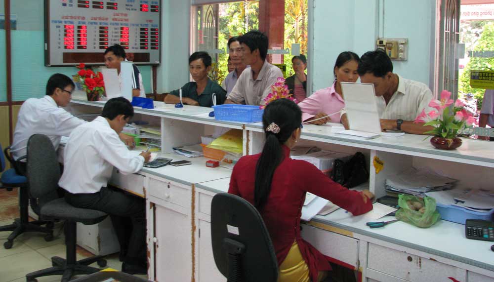 Ngân hàng Agribank chi nhánh Vĩnh Hưng thực hiện các thủ tục cho nông dân vay vốn