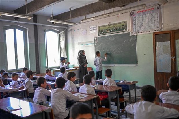 Một lớp học dành cho các nam sinh tại trường Istiklal ở Kabul, Afghanistan ngày 18/9/2021. (Ảnh: AFP/TTXVN)