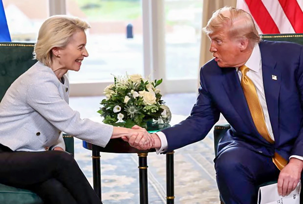 Tổng thống Mỹ Trump và Chủ tịch EC von der Leyen bắt tay sau khi đạt được thỏa thuận thương mại hồi năm ngoái. Ảnh: Reuters