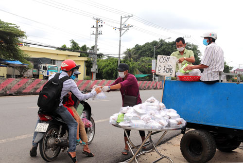 Sau khi nhận suất cơm miễn phí từ điểm phát cơm của gia đình ông Tài, ông Huỳnh Văn Hòa (59 tuổi) và người cháu ghé vào một căn nhà bỏ hoang ven Quốc lộ 1, vội vã ăn trưa. Trò chuyện cùng chúng tôi, ông Hòa cho hay: “Quê ở huyện Vũng Liêm, tỉnh Vĩnh Long, chú cháu lên TP.HCM phụ hồ, làm chưa được bao lâu thì xảy ra dịch bệnh, thất nghiệp đã 4 tháng nay. Hiện trên người còn chưa đến 20.000 đồng nên chú cháu quyết định chạy xe đạp về quê. Từ huyện Hóc Môn, TP.HCM đến tỉnh Long An là được hơn 1/3 đoạn đường, còn hơn 100km nữa là về đến nhà. Dọc đường được người dân tặng thức ăn, nước uống, nhờ đó mà có sức đi tiếp”.