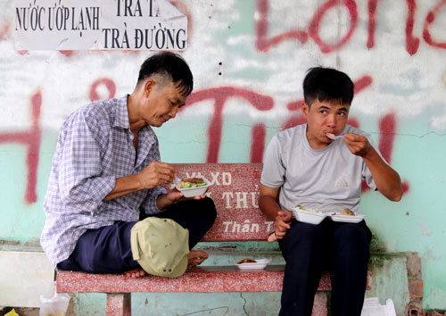 Ông Huỳnh Văn Hòa và cháu vội vã ăn trưa sau chặng đường dài hơn 60km từ huyện Hóc Môn, TP.HCM đến phường Khánh Hậu, TP.Tân An