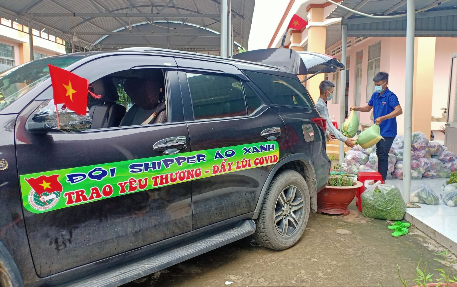 Vận chuyển nhu yếu phẩm lên xe đi cấp phát cho người dân
