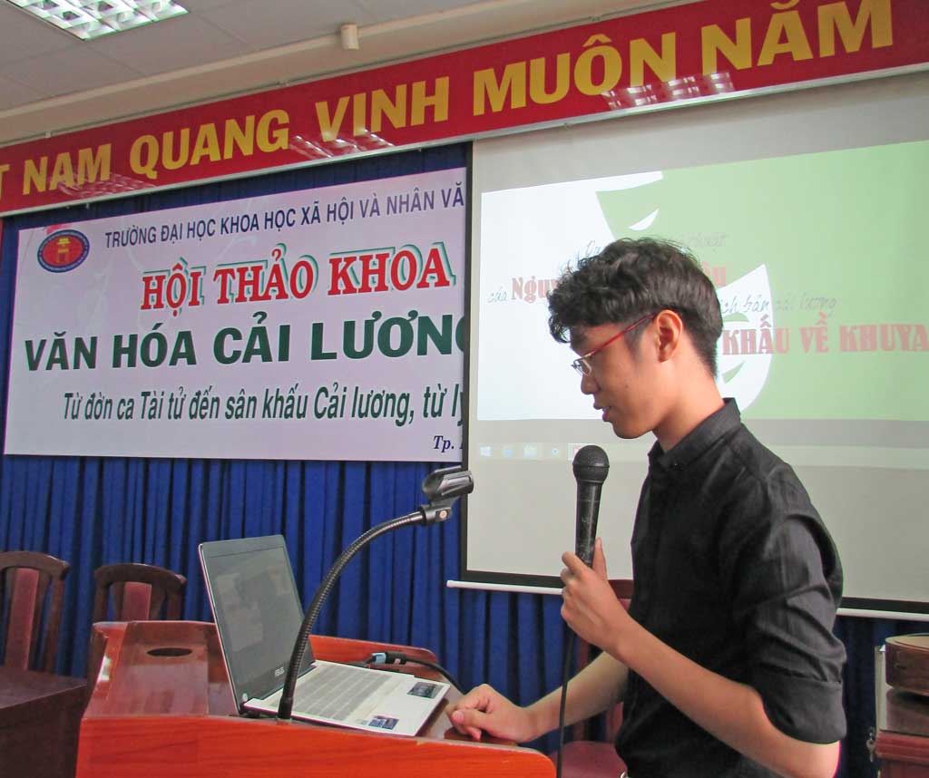 Đáng chú ý là hai tham luận của hai báo cáo viên trẻ: Vương Hoài Lâm (Nhà xuất bản Văn hóa Văn nghệ TP.HCM) với bài viết “Quan niệm nghệ thuật của Nguyễn Thành Châu trong kịch bản Cải lương Sân khấu về khuya” và ThS. Nguyễn Thị Tâm Anh (Trường Đại học Mở TP.HCM) với bài viết “Bảo tồn và phát huy nghề làm trang phục Cải lương ở TP.HCM”.