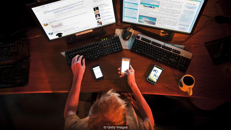 Hình minh họa một người nghiện mạng xã hội đặc trưng hiện nay, khi vừa online bằng máy tính vừa lướt điện thoại cùng lúc - Ảnh: Getty Images