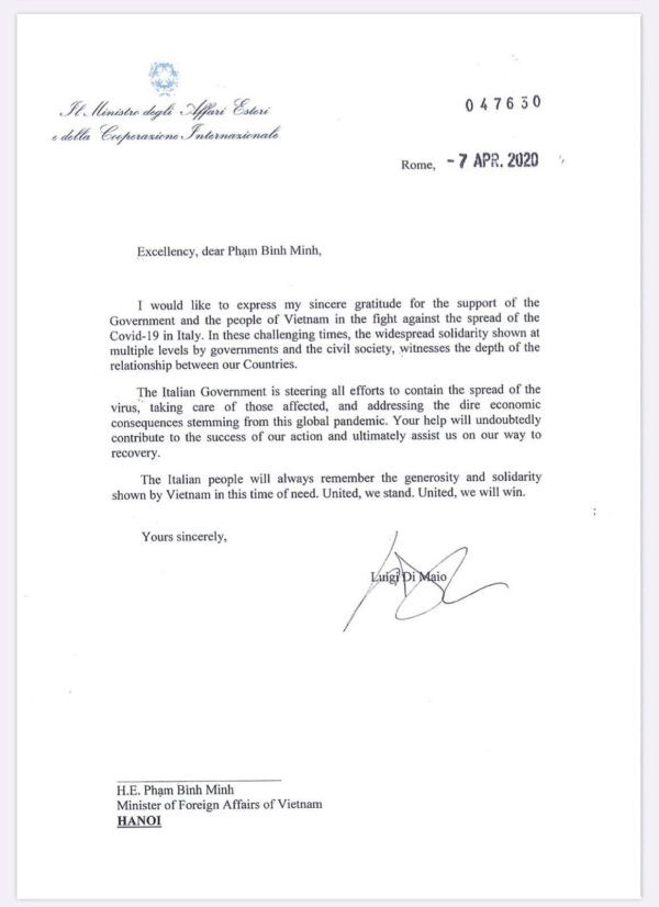 Tôi muốn bày tỏ lòng cảm ơn chân thành vì sự ủng hộ của Chính phủ và nhân dân Việt Nam trong cuộc chiến chống lại sự lây lan của dịch Covid-19 ở Italy. Trong thời điểm nhiều thách thức này, tinh thần đoàn kết rộng mở đã được thể hiện ở nhiều cấp độ bởi Chính phủ và các tổ chức xã hội và là minh chứng cho mối quan hệ sâu sắc giữa 2 nước chúng ta.