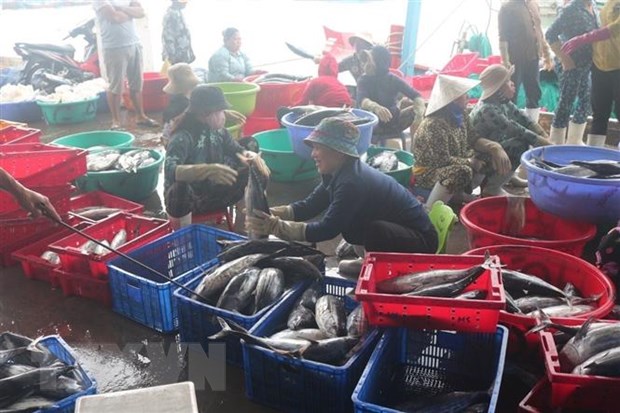 Niềm vui đánh bắt được mùa của nhiều tàu cá đánh bắt xuyên Tết đã trúng vụ cá ngừ sọc dưa, cá thu. (Ảnh: TTXVN phát)