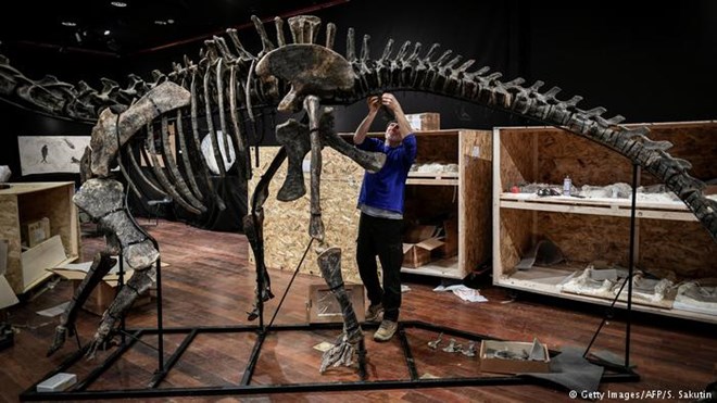 Một chuyên gia lắp ráp bộ xương khủng long trước khi đưa ra bán đấu giá. (Nguồn: AFP)