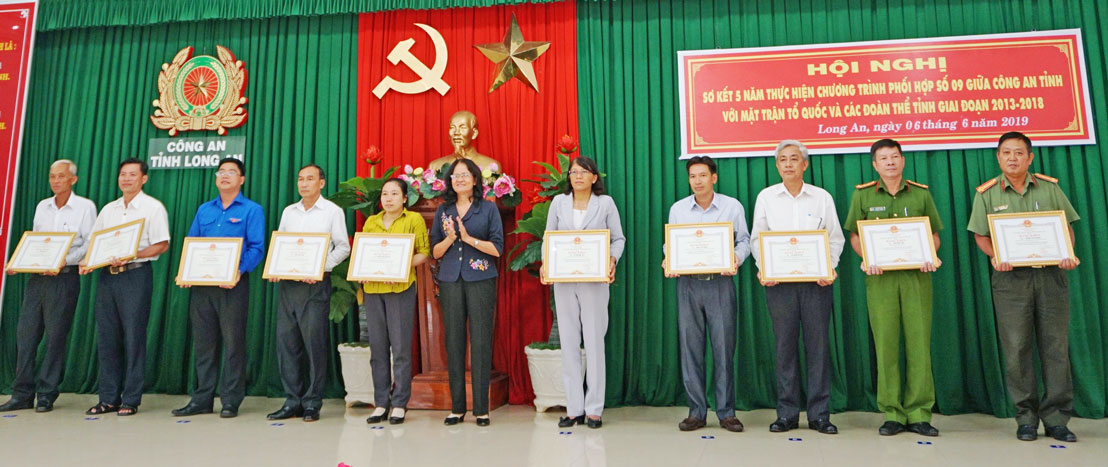 Chủ tịch Hội Người cao tuổi xã Mỹ Lộc - Biện Hữu Lẹ (bìa trái) nhận bằng khen của Chủ tịch UBND tỉnh vì thực hiện tốt phong trào Toàn dân bảo vệ an ninh Tổ quốc trong tình hình mới, giai đoạn 2013-2018