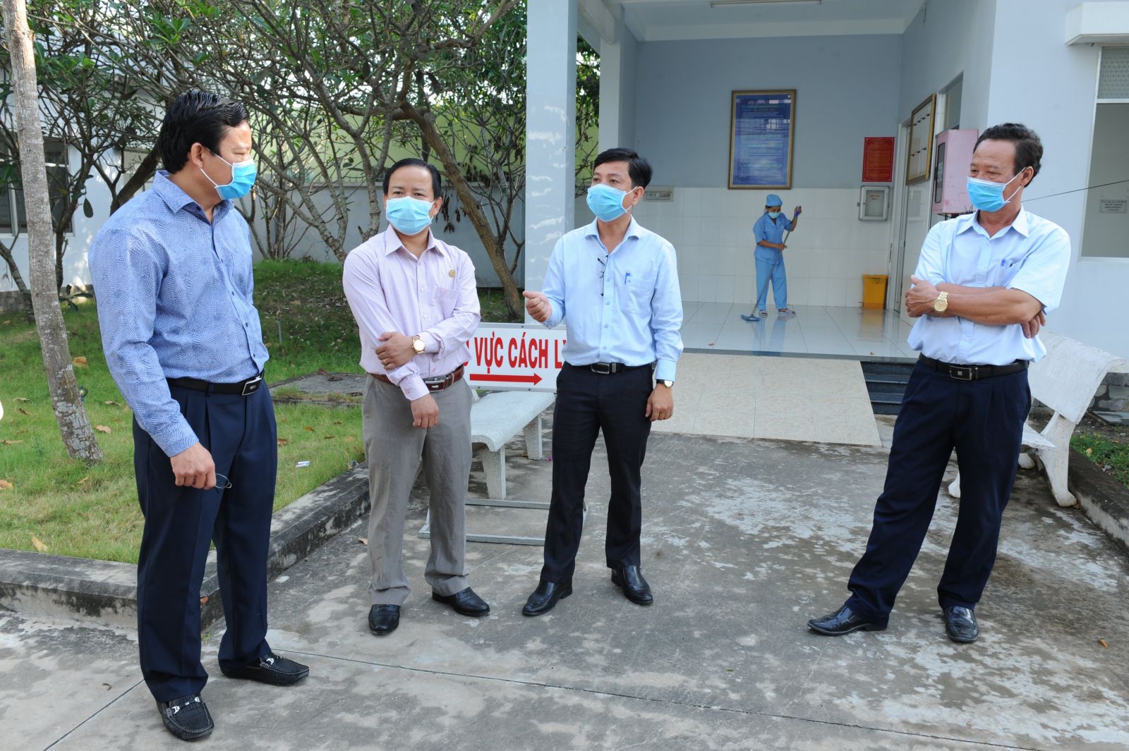 Bác sĩ Huỳnh Hữu Dững (thứ 2 từ phải qua) kiểm tra công tác phòng, chống dịch Covid-19 tại Khoa Nhiễm – Trung tâm Y tế huyện Thủ Thừa