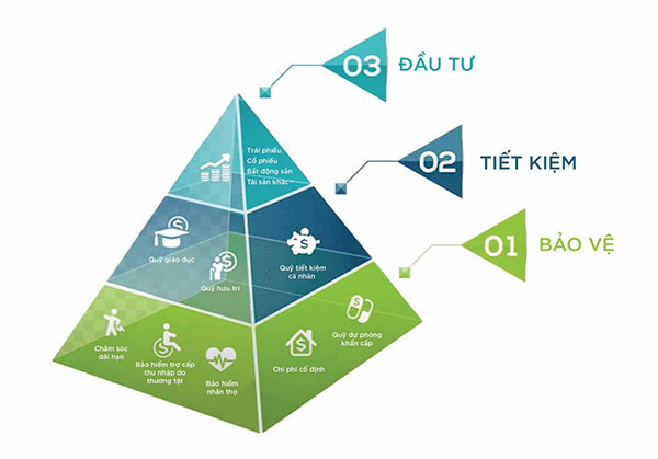Hình minh họa tháp tài sản với chức năng: bảo vệ, tiết kiệm, đầu tư. Ảnh: Prudential Việt Nam