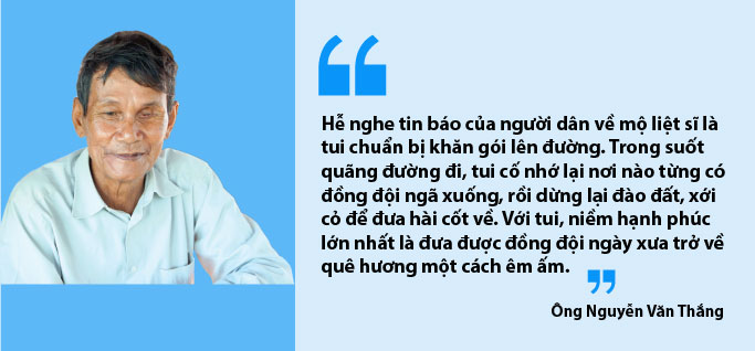 Thế nhưng càng về sau, ông lại càng ngậm ngùi bởi hành trình tìm kiếm gặp nhiều khó khăn. Mỗi ngày, mỗi tháng trôi đi, cơ hội để đưa đồng đội về nơi “chôn nhau, cắt rốn” càng trở nên hiếm hoi. Ông Thắng bộc bạch: “Ngày xưa, mình là bộ đội, đã chứng kiến nhiều người ngã xuống ngay trước mặt cho nên quay quắt không yên. Hơn nữa, mình thương đồng đội của mình thì mình làm thôi chứ nghĩ gì đâu”.