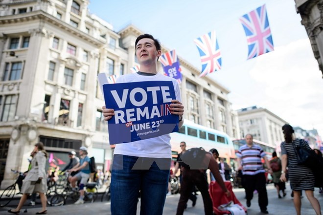 Giới trẻ tại Anh tham gia vận động ở lại EU tại thủ đô London ngày 21/6. (Nguồn: AFP/TTXVN)