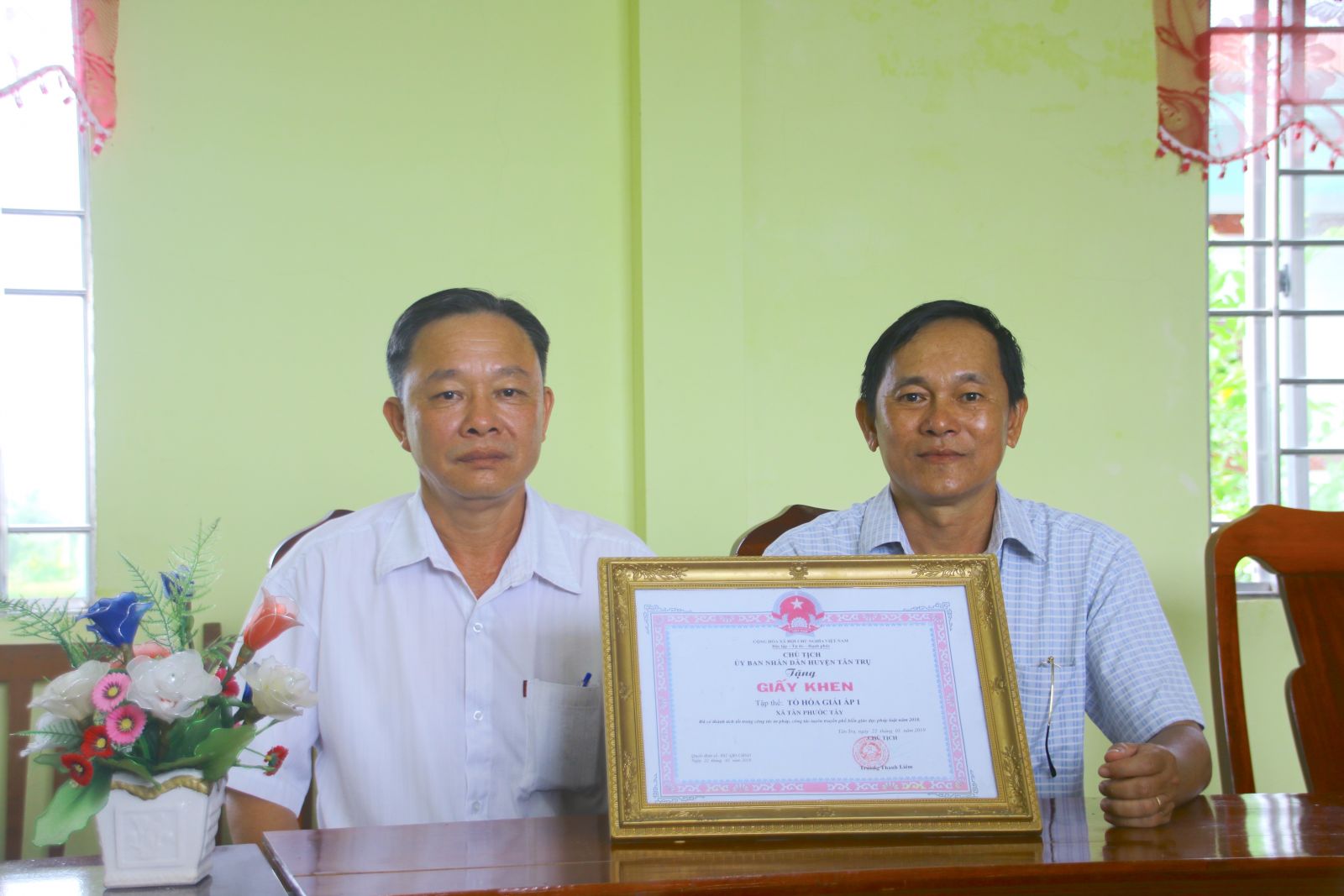 Với những đóng góp của ông Lưu Hồng Sơn (bên phải), Tổ hòa giải ấp 1, xã Tân Phước Tây được UBND huyện Tân Trụ khen thưởng