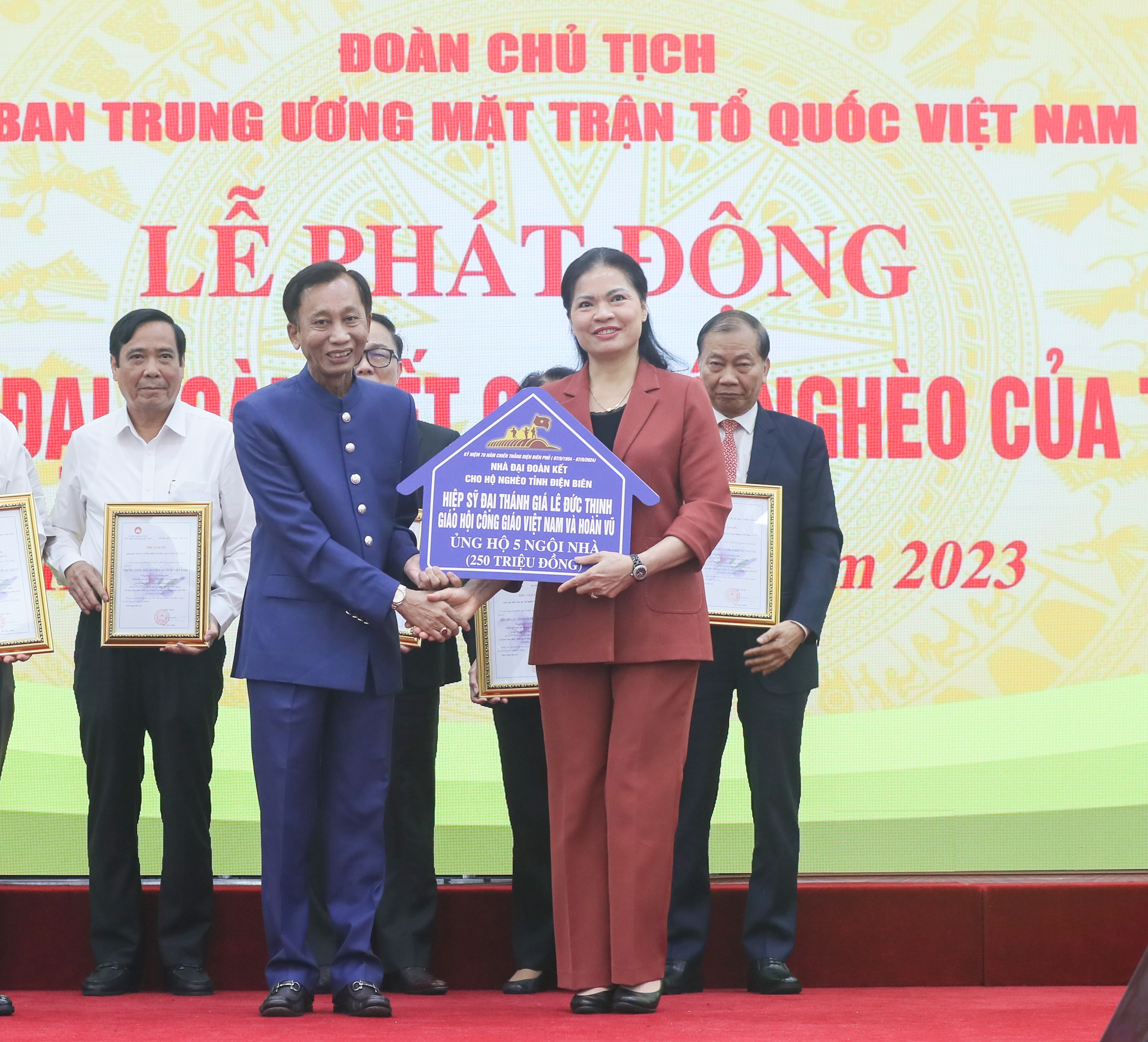 | Hiệp sĩ Đại Thánh giá Lê Đức Thịnh ủng hộ kinh phí xây nhà Đại đoàn kết cho hộ nghèo tại tỉnh Điện Biên. Ảnh: Quang Vinh |