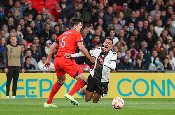 Maguire (trái) đốn ngã Musiala trong vòng cấm ở trận gặp tuyển Ðức. Ảnh: Talk Sport