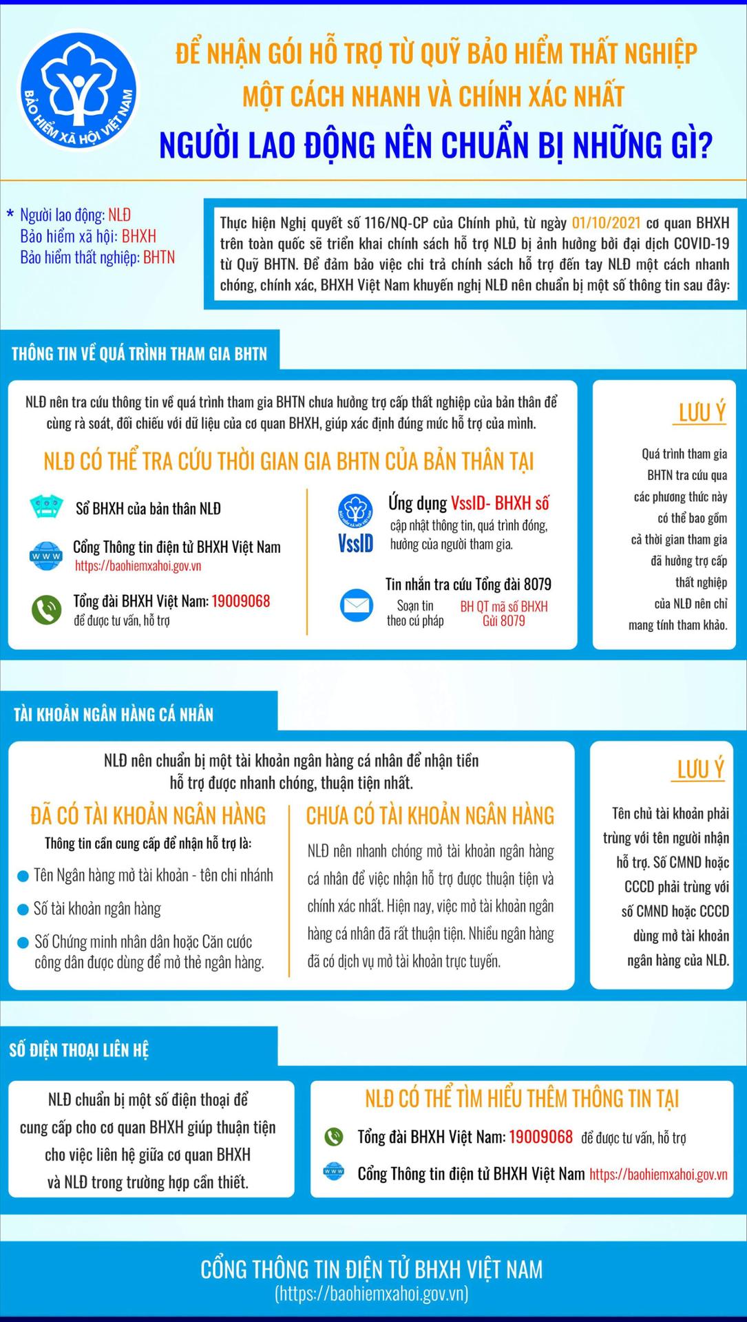 Theo Nghị quyết số 116/NQ-CP của Chính phủ, từ ngày 01/10/2021 toàn quốc, triển khai chính sách hỗ trợ người lao động và người sử dụng lao động bị ảnh hưởng bởi đại dịch COVID-19 từ Quỹ Bảo hiểm thất nghiệp (BHTN). Để đảm bảo quyền lợi và nhận hỗ trợ một cách nhanh chóng, chính xác, BHXH Việt Nam khuyến nghị, người lao động nên chuẩn bị một số thông tin sau đây: